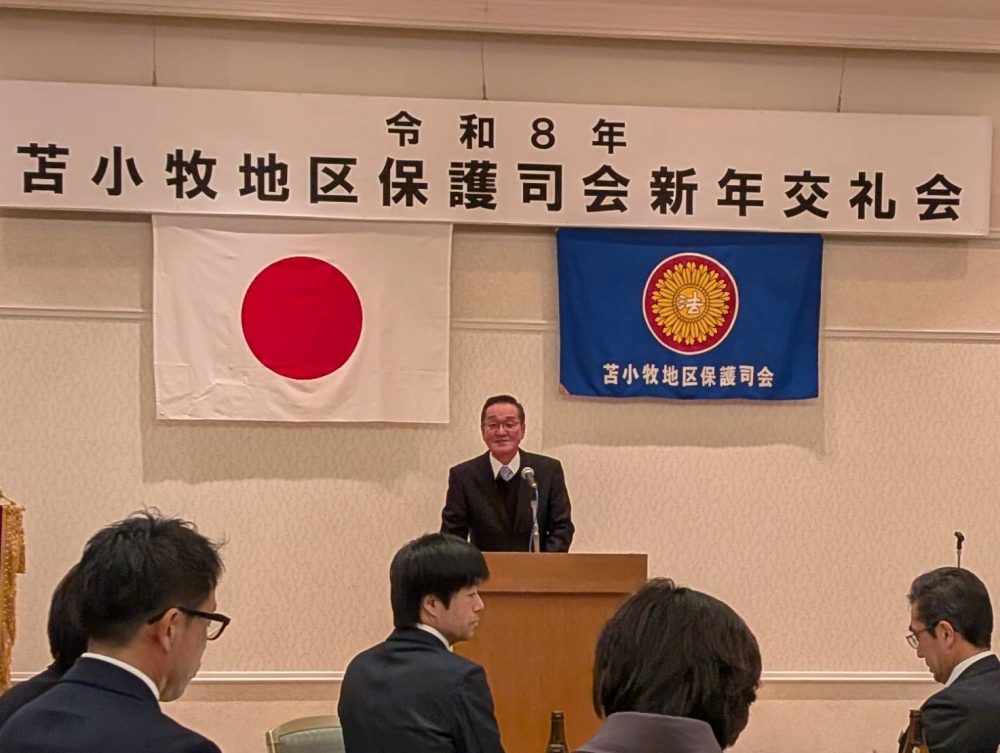 令和8年苫小牧地区保護司会新年交礼会をグランドホテルニュー王子 白樺の間にて開催いたしました。札幌保護観察所統括保護観察官 松原氏をはじめ、たくさんの来賓の方にご出席賜り、現役並びにOB保護司とあわせて約50名で情報交換や近況報告に花を咲かせました。それに加え、安平分区所属保護司小坂宴会部長MCのビンゴ大会で大盛り上がり!!そして毎年恒例の『ひまわりの譜』大合唱で最後を飾り、にぎやかな宴となりました。ご出席いただきましたたくさんのみなさま、本当にありがとうございました!!